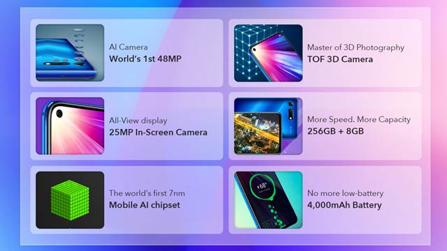 Honor View 20 के फीचर्स: Honor View 20 मैजिक यूआई 2.0.1 पर आधारित एंड्रॉइड 9.0 पाई पर काम करता है। इसमें 6.4 इंच का फुल-एचडी+ टीएफटी एलसीडी डिस्प्ले दिया गया है। इसका पिक्सल रेजोल्यूशन 1080x2310 है। इसका आस्पेक्ट रेश्यो 19.5:9 है। इसका स्क्रीन टू बॉडी रेश्यो 91.82 फीसद है। यह फोन 7एनएम ऑक्टा-कोर हाइसिलिकॉन किरिन 980 प्रोसेसर से लैस है। इसमें माइक्रोएसडी कार्ड का सपोर्ट नहीं दिया गया है। फोन को पावर देने के लिए 4000 एमएएच की बैटरी दी गई है। यह फास्ट चार्जिंग को सपोर्ट करती है। इसमें लिंक टर्बो टेक्नोलॉजी का भी इस्तेमाल किया गया है जिसकी मदद से फोन अपने आप ही डाटा और वाई-फाई के बीच स्विच कर लेता है। इसे लिक्विड कूलिंग सिस्टम के साथ पेश किया गया है।