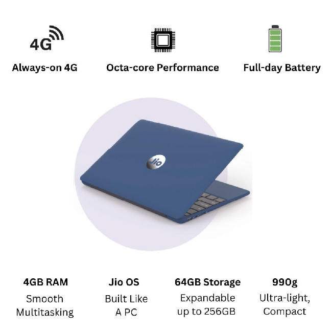 JioBook 2023 भारत में लॉन्च हो गया है। रिलायंस जियो का यह लैपटॉप 4G सिम सपोर्ट के साथ आता है। यह भारत का सबसे अफोर्डेबल लैपटॉप है। जियो बुक लैपटॉप को कंपनी ने पिछले साल के मुकाबले कई अपग्रेड के साथ लॉन्च किया है। लेटेस्ट JioBook लैपटॉप में कनेक्टिविटी के लिए 4G के साथ-साथ Wi-Fi ब्लूटूथ और HDMI पोर्ट का सपोर्ट दिया गया है।