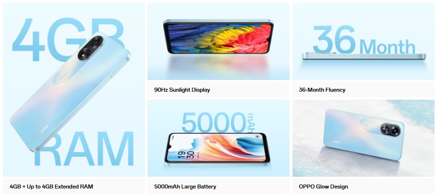 Oppo A18 के 4GB रैम और 128GB स्टोरेज की कीमत 9,999 रुपये तय कर दी है। इस डिवाइस को ग्लोइंग ब्लू और ग्लोइंग ब्लैक कलर ऑप्शन में खरीदा जा सकता है। इस डिवाइस को आप Oppo स्टोर से ऑनलाइन और रिटेल स्टोर से ऑफलाइन खरीद सकते हैं।
