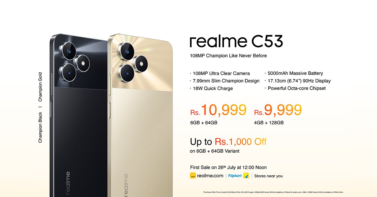 Realme ने भारत मे अपने नए स्मार्टफोन Realme C53 को लॉन्च कर दिया है। यह एक बजट फोन है जिसकी शुरुआती कीमत 9999 रुपये रखी गई है। इसस फोन की सबसे खास बात इसका कैमरा है। इस प्राइस सेगमेंट में कंपनी कस्टमर्स को 108MP का कैमरा दे रही है। इसके अलावा इस फोन में 5000mAh की बैटरी मिलती है। आइये इसके बारे में विस्तार से जानते हैं।