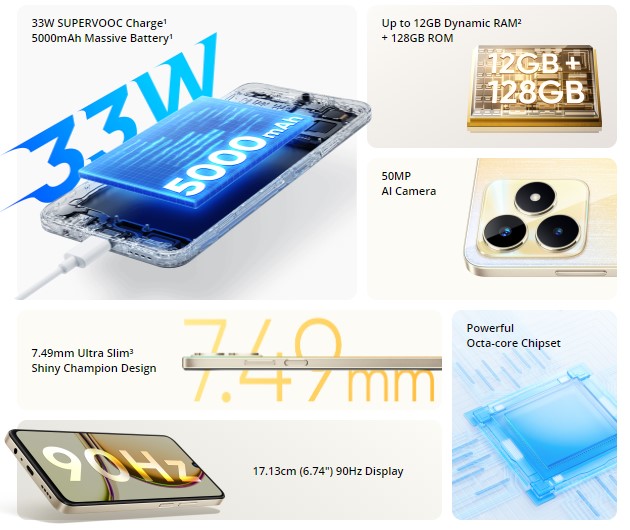 इस स्मार्टफोन में 12GB तक रैम और 128GB तक स्टोरेज मिलता है। इस स्मार्टफोन में 18W के फास्ट चार्जिंग सपोर्ट के साथ 5,000mAh की बैटरी है और यह एंड्रॉइड 13-आधारित Realme UI पर चलेगा।