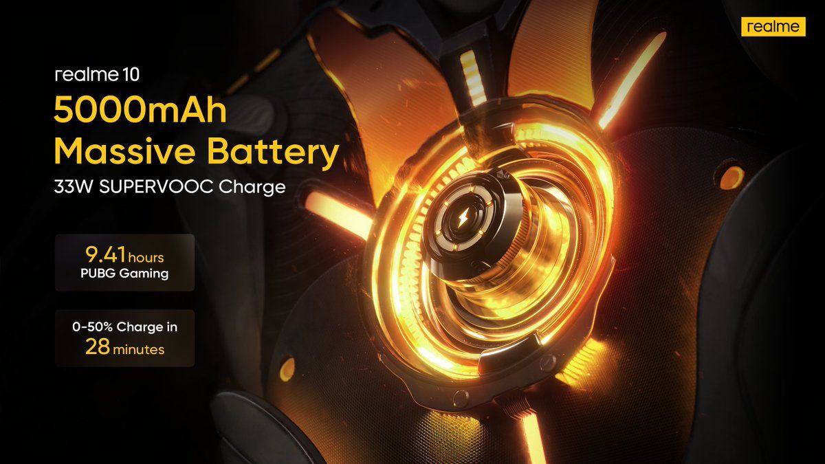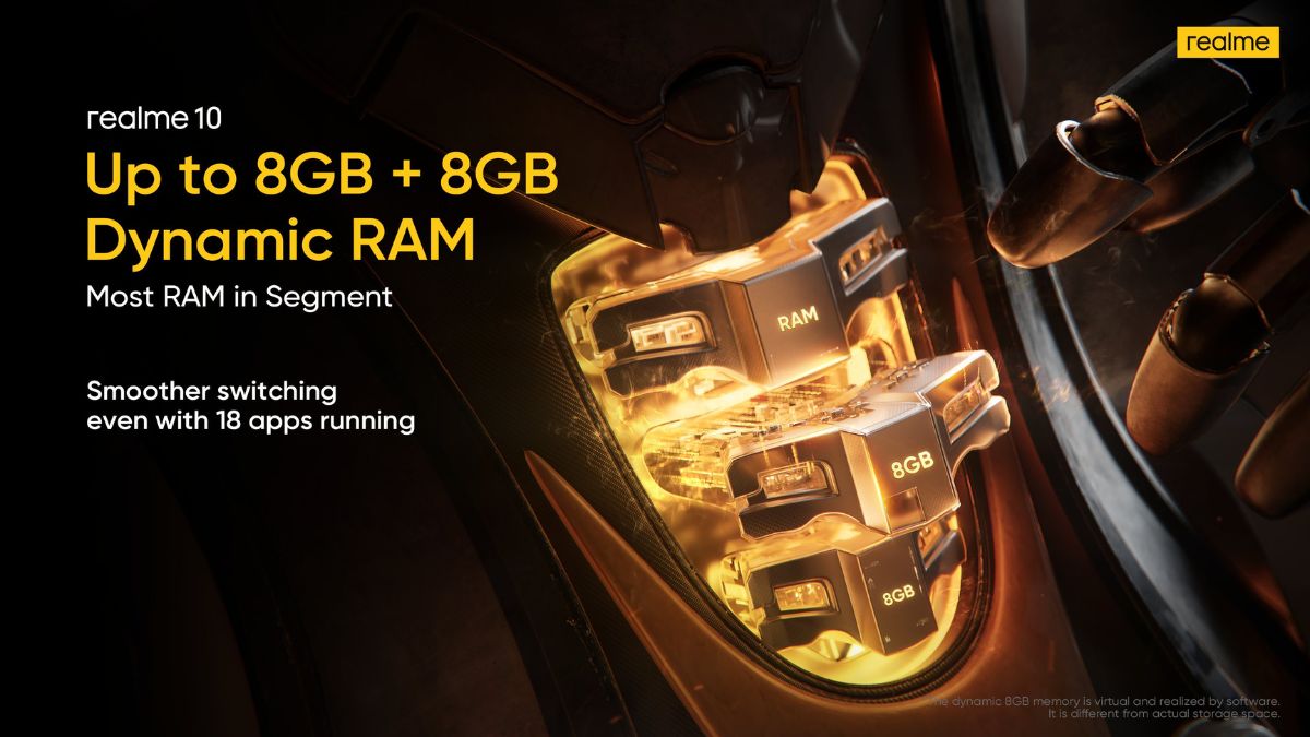 Realme 10 में 2400 x 1080 पिक्सल रेजोल्यूशन और 90Hz रिफ्रेश रेट के साथ 6.4 इंच के फुल-एचडी + AMOLED डिस्प्ले के साथ आता है।फोन के फ्रंट पैनल में टॉप लेफ्ट कॉर्नर पर एक पंच होल भी है, जिसमें सेल्फी कैमरा सेंसर है। इसके अलावा Realme 10 में MediaTek Helio G99 प्रोसेसर मिलता है, जिसमें 8GB तक LPDDR4x रैम और 256GB UFS 2.2 स्टोरेज दिया गया है। इस फोन में वर्चुअल रैम टेक्नोलॉजी भी मिलती है जो रैम क्षमता को बढ़ाने के लिए स्टोरेज का उपयोग करता है।Realme 10 में एंड्रॉयड 12-आधारित Realme UI 3.0 पर काम करता है।