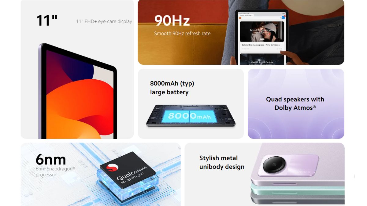 टैबलेट में 28 घंटे का लंबा बैटरी लाइफ सपोर्ट देने वाली 8000mAh की बैटरी दी गई है। यह 10 वॉट के चार्जर से यूएसबी टाइप सी पोर्ट के जरिये चार्ज होती है। इसमें 3.5 mm ऑडियो जैक डॉल्बी एटमॉस के साथ क्वाड स्पीकर सेटअप और Hi-Res ऑडियो सपोर्ट दिया गया है। यह एंड्रॉइड आधारित MIUI ऑपरेटिंग सिस्टम पर रन होता है। इसमें एआई फेस अनलॉक फीचर भी दिया गया है।