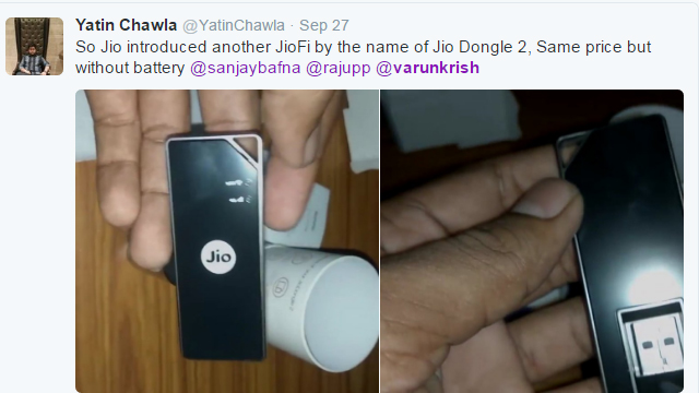 क्या आपको भी रिलायंस जिओ सिम नहीं मिल पा रही है? तो हम आपके लिए एक खुशखबरी लाए हैं। दरअसल, जिओ ने Dongle 2 लांच किया है जिसके जरिए यूजर्स रिलायंस जिओ का इंटरनेट इस्तेमाल कर पाएंगे। इस बात की जानकारी ट्विटर यूजर यतिन चावला ने दी है। यतिन की मानें तो कंपनी नई डिवाइस Jio Dongle 2 लेकर आई है। इस डिवाइस को इस्तेमाल करने के लिए आपको किसी भी 4जी मोबाइल की आवश्यकता नहीं है। आपको बता दें कि इस डिवाइस में बैटरी नहीं दी गई है। ऐसे में वाइ-फाइ चलाने के लिए आपको इस डिवाइस को अपने कंप्यूटर या लैपटॉप से कनेक्ट करना होगा। यतिन ने बताया है कि इस डिवाइस की कीमत 1999 रुपये है।