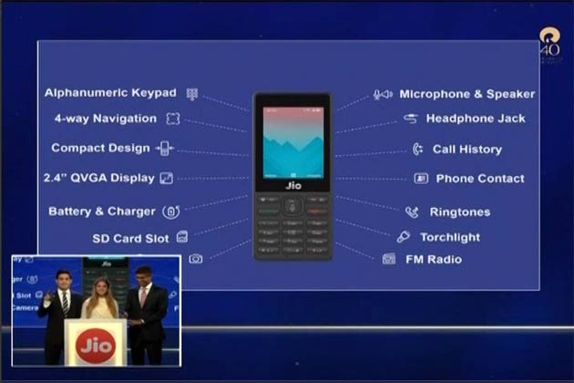 नई दिल्ली (जेएनएन)। रिलायंस इंडस्ट्री की सालाना आम बैठक (एजीएम) में मुकेश अंबानी ने देश के सबसे सस्ते 4जी फीचर फोन से पर्दा उठाया। इसका नाम जियोफोन रख गया है जिसको मुकेश अंबनी ने सबसे इंटेलिजेंट मोबाइल बताया है। लॉन्च हुए इस नए फोन का डेमो मुकेश अंबनी के बेटे आकाश अंबानी और बेटी ईशा अंबनी ने दिया। इनके साथ कंपनी के एक अधिकारी किरण मैथ्यू भी मौजूद थे। इस फोन को पूरी तरह से मेड इन डंडिया बताया गया है। इस फोन को फ्री में लॉन्च किया गया है। हालांकि, इसके लिए ग्राहकों को 1,500 रुपये की सिक्योरिटी राशि देनी होगी जो 3 साल बाद यूजर्स को वापस दे दी जाएगी। इस फोन को 24 अगस्त से प्री-ऑर्डर किया जा सकता है। इसके लिए यूजर्स को जियो रिटेलर के पास जाना होगा। इसके बाद सिंतबर से फोन मिलने शुरु हो जाएंगे।