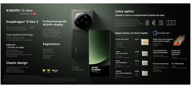 Xiaomi 13 Ultra डुअल सिम (नैनो) और 6.73-इंच AMOLED WQHD+ (3,200 x 1,440) डिस्प्ले के साथ आता है। इस स्क्रीन की रिफ्रेश रेट 120Hz तक है और इसका टच सैंपलिंग रेट 360Hz है। इसकी डिस्प्ले का ब्राइटनेस लेवल 1,300 nits है और यह एंड्रॉइड 13 आउट-ऑफ-द-बॉक्स पर आधारित MIUI 14 चलाता है। Xiaomi 13 Ultra में 90W वायर्ड और 50W वायरलेस फास्ट चार्जिंग सपोर्ट के साथ 5,000mAh की बैटरी यूनिट दिया गया है। वायर्ड फास्ट चार्जिंग सॉल्यूशन से ये स्मार्टफोन 34 मिनट में फुल चार्ज हो सकेगा।