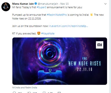 नई दिल्ली (टेक डेस्क)। चीनी स्मार्टफोन कंपनी Xiaomi आज भारत में अपने Redmi Note सीरीज के अगले स्मार्टफोन Redmi Note 6 Pro को लॉन्च किया है। इस स्मार्टफोन को पहले ही थाइलैंड और इंडोनेशिया में लॉन्च किया जा चुका है। शाओमी इस स्मार्टफोन को कल यानी 23 नवंबर से Black Friday Sale 2018 के तहत बेचेगा। Redmi Note 6 Pro स्मार्टफोन के लॉन्च के बारे में Xiaomi के कंट्री हेड मनु कुमार जैन ने ट्विटर के जानकारी दी थी। उन्होंने अपने ट्विटर हैंडल से इस फोन के लॉन्च की तारीख की घोषणा की है। इस स्मार्टफोन का मुकाबला एचएमडी ग्लोबल के हाल ही में लॉन्च हुए स्मार्टफोन Nokia 6.1 Plus और Realme 2 Pro से होगा। आइए, जानते हैं इस स्मार्टफोन की कीमत से लेकर फीचर्स तक