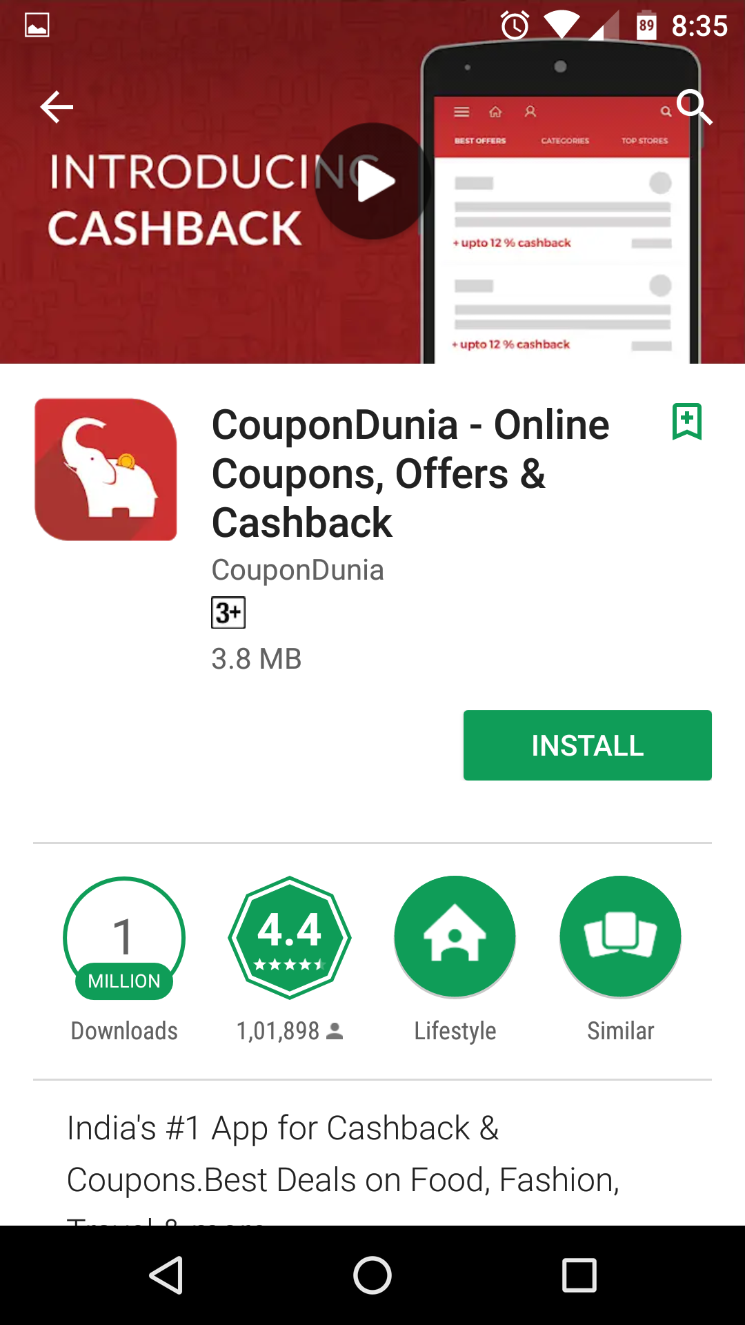 CouponDunia: एप को 10 लाख यूजर्स ने डाउनलोड किया है। एप को प्ले स्टोर पर 4.4 स्टार मिला है, जिसे 1 लाख से ज्यादा यूजर्स ने रेटिंग दी है। एप की साइज 3.8 एमबी है।