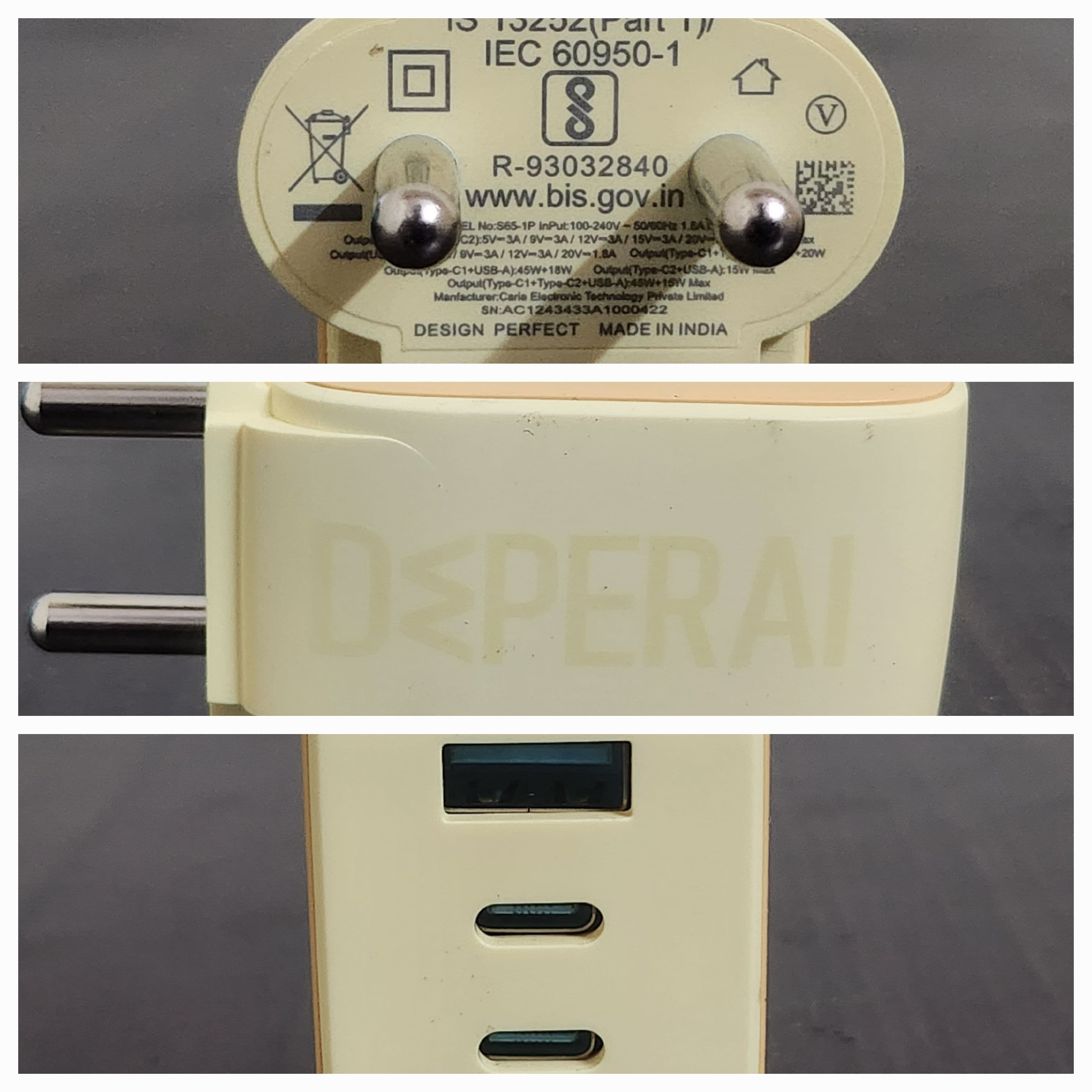 DeperAI 65W 3-in-1 चार्जर में बॉक्सी शेप वाला डिजाइन है। जहां कॉर्नर्स में कर्व है। चार्जर में येलो का एक पेल शेड यूज किया गया है। जो इसे प्रीमियम लुक देता है। इसकी बॉडी प्लास्टिक की है, लेकिन रबर जैसा सॉफ्ट फील देती है। यहां फ्रंट में दो Type-C और एक USB A पोर्ट दिया गया है। यहां टोटल तीन चार्जिंग पोर्ट्स हैं। चार्जर के टॉप में यहां DeperAI का लोगो एनग्रेव किया गया है। जो इसे प्रीमियम लुक देता है। चार्जर का ओवरऑल लुक काफी प्रीमियम है और बॉडी फिनिशिंग भी काफी शानदार है।