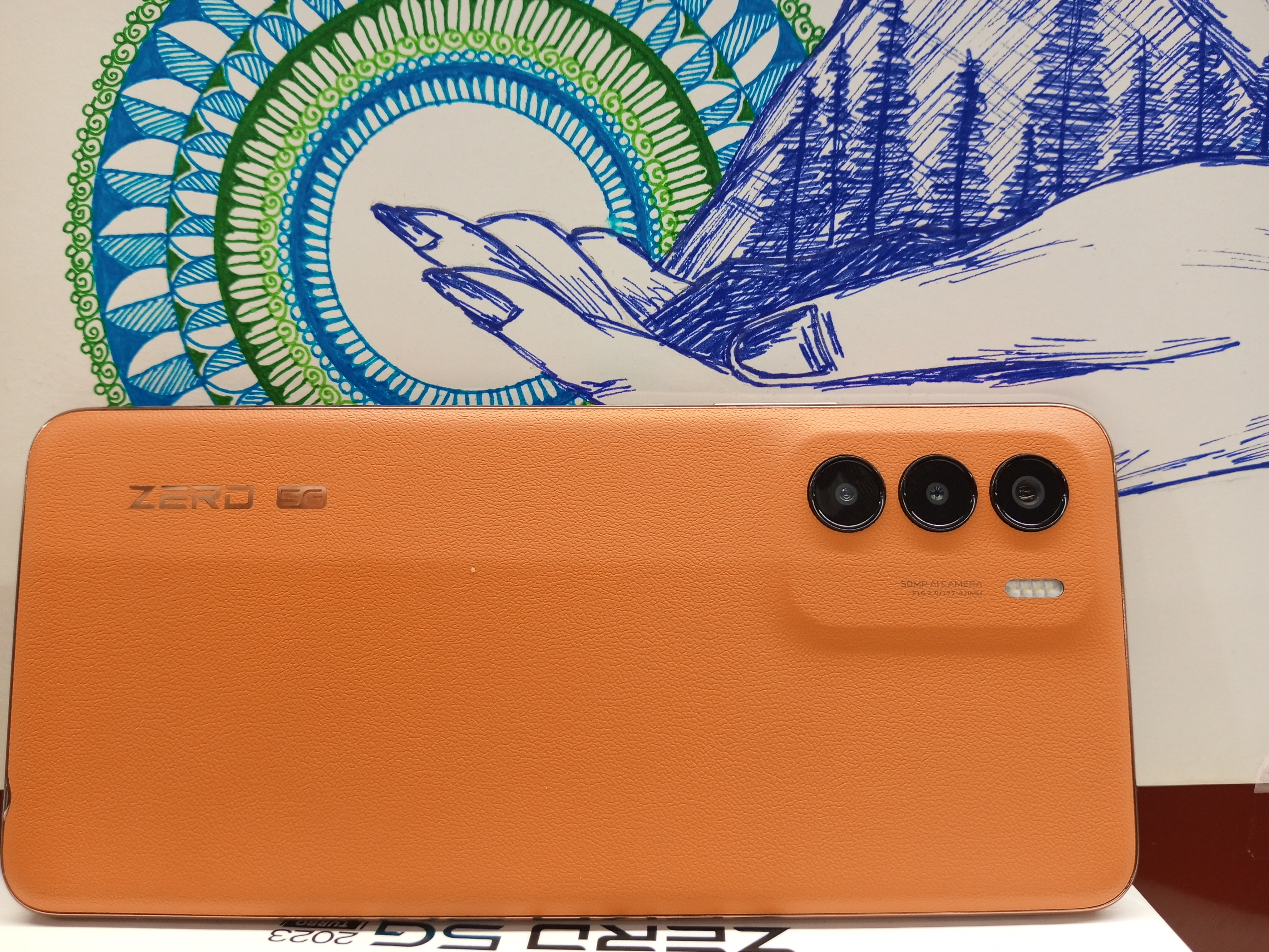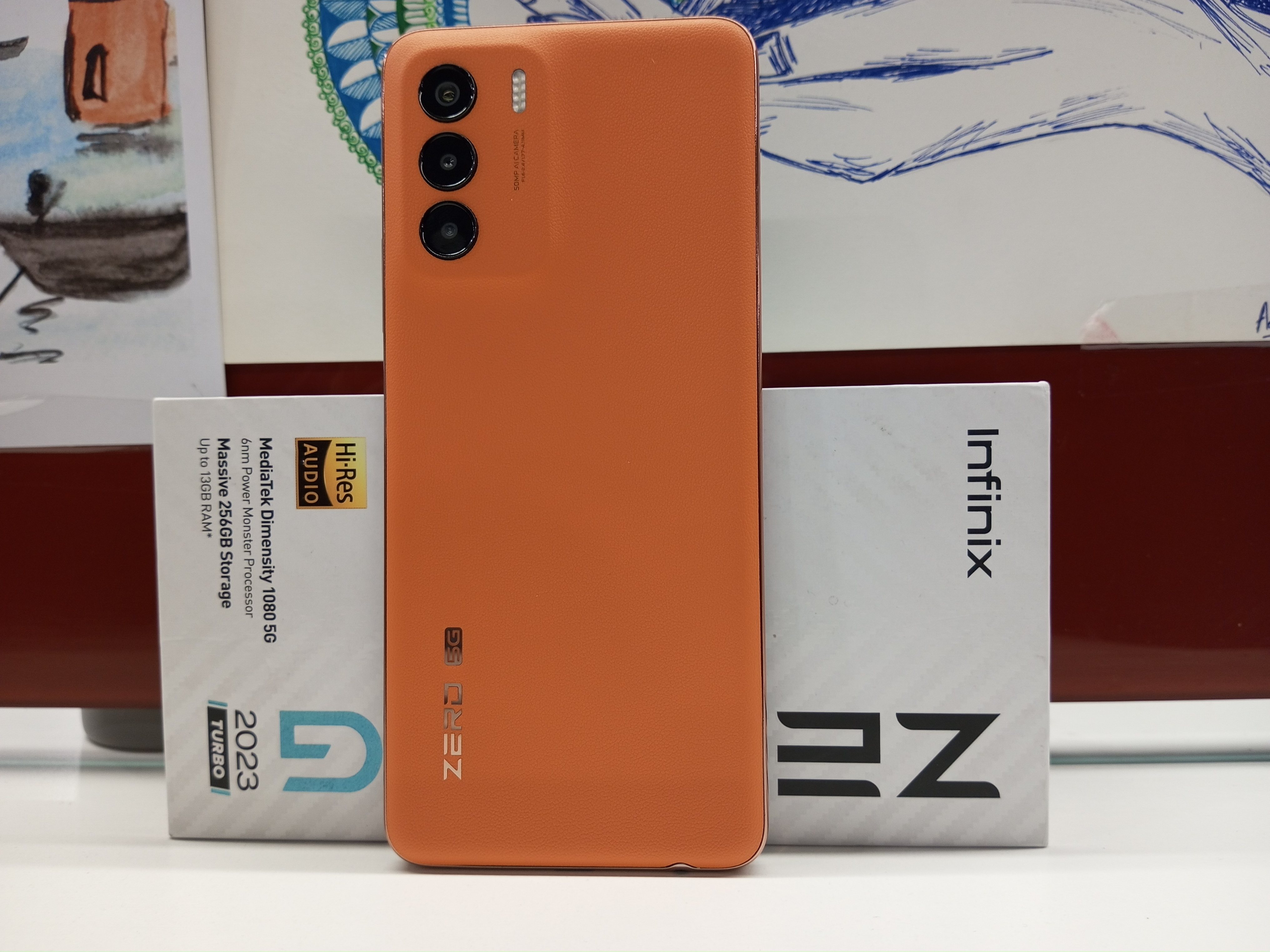 Infinix Zero 5G 2023 में शानदार आपको एक शानदार डिजाइन मिलता है और हमें इस फोन का ऑरेंज कलर वेरिएंट दिया गया है। इसमें वीगन लेदर बैक है, जो आपके फोन के प्रीमियम लुक देता है। बैक पैनल का प्रीमियम लुक के साथ पीछे की तरफ ऊभरा हुआ कैमरा यूनिट मिलती है। इसके अलावा आपको नीचे बाईं ओर एक छोटी जीरो 5G ब्रांडिंग देखने को मिलती है।