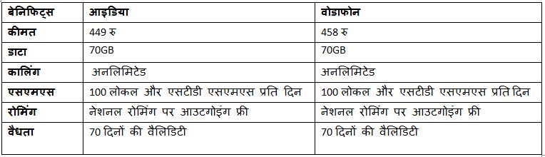 वोडाफोन 458 रुपये का प्लान: वोडाफोन का 458 रुपये का प्लान 70GB डाटा का लाभ देता है। कंपनी अनलिमिटेड कॉल्स, फ्री इनकमिंग रोमिंग और 100 एसएमएस प्रति दिन की सुविधा देती है। प्लान की वैलिडिटी 70 दिनों की है।