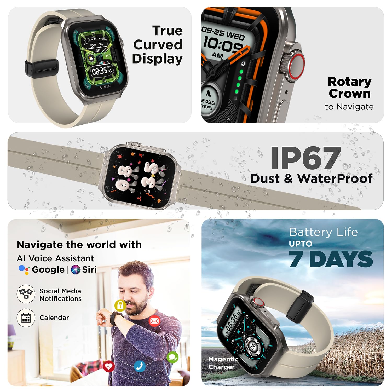 Skyball में आपको आयताकार डिस्प्ले मिलता है, इसमें आपको सिलिकॉन स्टैप मिलता है। हमारे पास जो डिवाइस आई है, वो सफेद कलर की है। इसके अलावा आपको तीन कलर ऑप्शन भी मिलते हैं, जिसमें Black, Moon Light Grey, Teal Green शामिल है। डिस्प्ले की बात करें तो आपको इसमें 2.02 इंच का डिस्प्ले मिलता है।