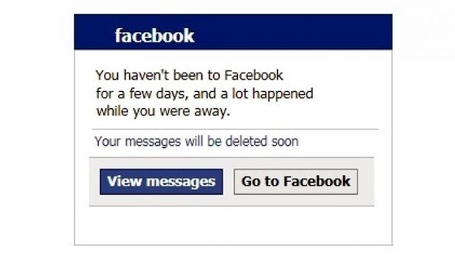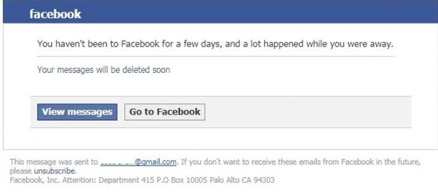 ई-मेल स्कैम का एक नया मामला सामने आया है जिसमें दावा किया गया है कि भेजा गया मेल फेसबुक की नोटिफिकेशन है। मेल के सब्जेक्ट में लिखा गया है “आपके मैसेज जल्द ही डिलीट कर दिए जाएंगे।” मेल की बॉडी में लिखा गया है “आपने कई दिनों से फेसबुक का इस्तेमाल नहीं किया है और आपकी गैरमौजूदगी में फेसबुक पर बहुत कुछ हुआ है।” इसके नीचे दो लिंक दिए गए हैं। एक लिंक view the message की और दूसरी लिंक go to Facebook का है। इसके साथ ही मैसेज में दिया गया फुटर (footer) फेसबुक मेल्स के फुटर की ही तरह है।