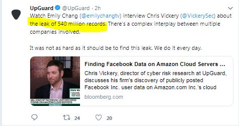 रिसर्चर्स के राइट अप के मुताबिक, मैक्सिको बेस्ड डिजिटल मीडिया कंपनी कल्ट्रा कलेक्टिवा ने 540 मिलियन रिकॉर्ड्स को छोड़ दिया, जिस डाटा को कोई भी एक्सेस कर सकता है। इन फेसबुक यूजर्स के डाटा में कमेंट्स, लाइक्स, रिएक्शन्स, अकाउंट नेम आदि जानकारियां शामिल हैं। ये डाटा Amazon S3 सर्वर पर बिना किसी पासवर्ड के स्टोर किए गए थे। इसके अलावा एक और डाटा बैक अप फाइल कैलिफॉर्निया बेस्ड ऐप मेकर कंपनी द पुल के सर्वर पर स्टोर हो गया जिसमें 22,000 यूजर्स का डाटा सेव था। इस बैक अप फाइल में यूजर्स के फ्रेंड लिस्ट, इंटरेस्ट, फोटो, ग्रुप मेंबरशिप और चेक इन जैसी जानकारियां शामिल थी। UpGuard के साइबर रिस्क टीम ने इस बात की जानकारी एक ब्लॉग पोस्ट के जरिए दी है।