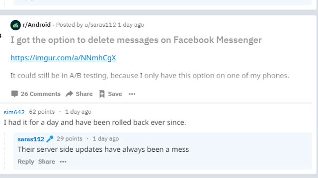 नई दिल्ली (टेक डेस्क)। इंस्टैंट मैसेजिंग ऐप WhatsApp पर कुछ समय पहले Delete या Unsend Message बटन फीचर पेश किया था। यह फीचर WhatsApp पर काफी लोकप्रिय हुआ है। अब यह फीचर जल्द ही Facebook पर पेश किया जा सकता है। इस फीचर को सबसे पहले एक Reddit यूजर ने स्पॉट किया है। यह फीचर Messenger में देखा गया है। माना जा रहा है कि यह फीचर बिल्कुल WhatsApp की तरह ही काम करेगा।