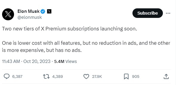 - मस्क ने अपने पोस्ट में कहा कि एक्स प्रीमियम सब्सक्रिप्शन के दो नए स्तर जल्द ही लॉन्च होंगे। एक तो सभी सुविधाओं के साथ कम लागत, लेकिन विज्ञापनों के साथ आएगा और दूसरा अधिक महंगा, लेकिन इसमें कोई विज्ञापन नहीं होंगें।