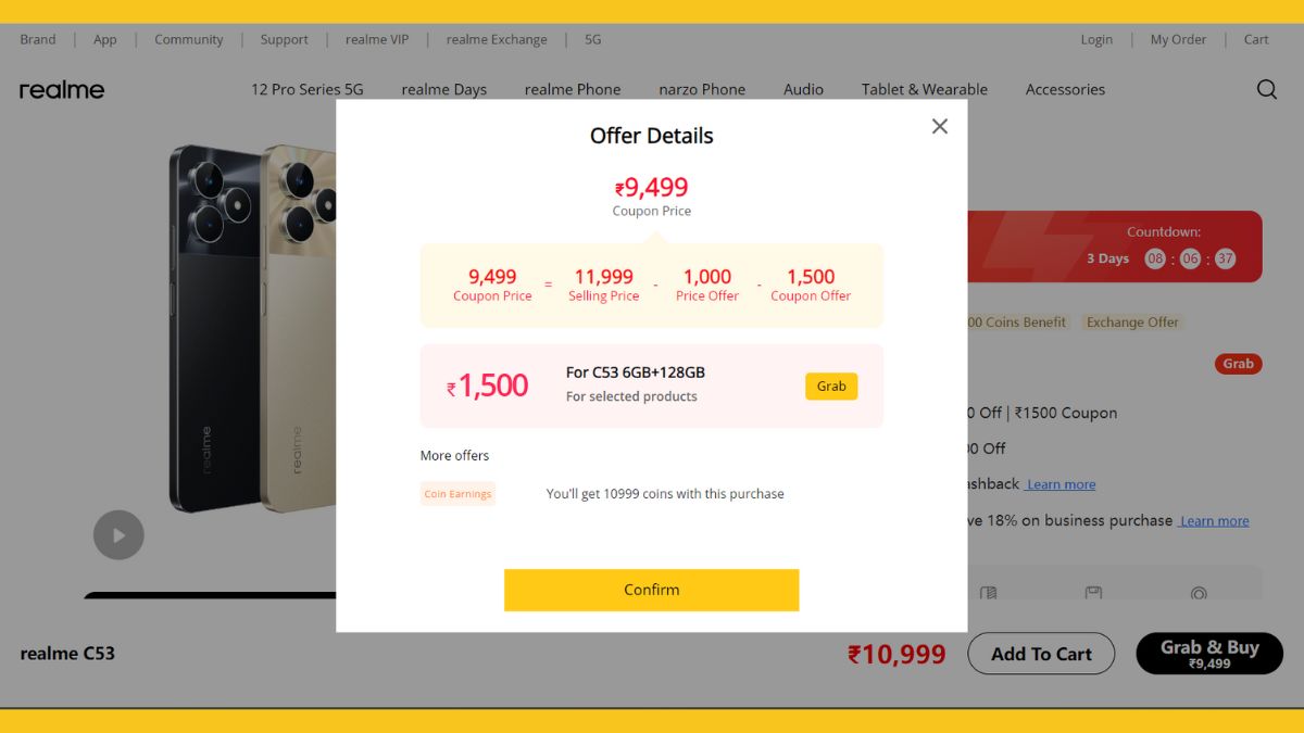 realme C53 के 6GB रैम और 128GB स्टोरेज वेरिएंट को कम कीमत में खरीद सकते हैं। दरअसल, कंपनी का यह फोन 11,999 रुपये में ऑफर किया जाता है।
