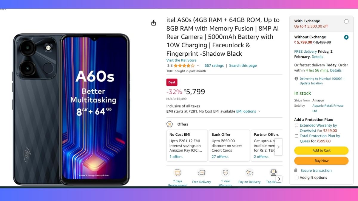 इस फोन को अमेजन से खरीदते हैं तो 4GB RAM + 64GB ROM वेरिएंट को 5,799 रुपये में खरीद सकते हैं।