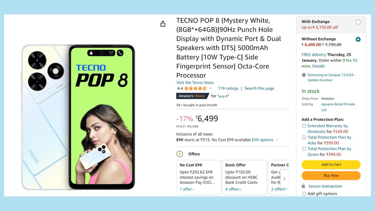 दरअसल, हम यहां टेक्नो के न्यूली लॉन्च्ड स्मार्टफोन TECNO POP 8 की बात कर रहे हैं। इस फोन को ऑनलाइन शॉपिंग वेबसाइट अमेजन से इस फोन को खरीदा जा सकता है।