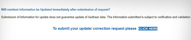 जरुरी नहीं है की अपडेट के लिए सबमिट की गई जानकारी से आपका आधार कार्ड अपडेट हो जाए। दी गई जानकारी पहले वेरीफाई और वैलिडेट की जाएगी। UADAI पोर्टल पर रजिस्टर्ड यूजर्स अपने ईमेल आईडी और पासवर्ड का इस्तेमाल कर के भी अपडेट रिक्वेस्ट कर सकते हैं।
