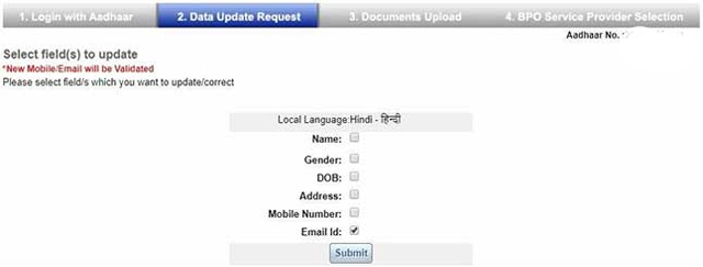 5- जो भी जानकारी आप अपडेट करना चाहते हैं उन्हें सेलेक्ट कर के सबमिट पर क्लिक करें। आप नाम, लिंग, जन्म तिथि, पता, मोबाइल नंबर ओर ईमेल में से चुनाव कर सकते हैं। अन्य अपडेट सके लिए आपको अपडेट सेंटर जाना होगा।