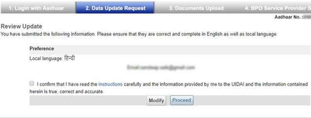 10- UIDAI का ऑनलाइन अपडेशन टूल आपके द्वारा दी गई जानकारी को वेरीफाई करता है। अपनी एंट्री को चेक कर लें। अगर आप दोबारा बदलाव करना चाहते हैं तो मॉडिफाई पर क्लिक कर के आगे स्टेप्स फॉलो करें। अगर सब ठीक है तो घोषणा चेकबॉक्स पर क्लिक कर आगे बढ़ें।