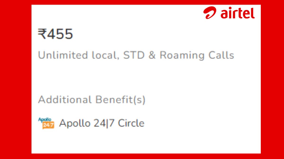 | एयरटेल | 455 रुपये | डेटा-6GB, अनलिमिटेड लॉकल, एसटीडी, रोमिंग कॉल, Apollo 24/7 Circle, Free Hellotines |
