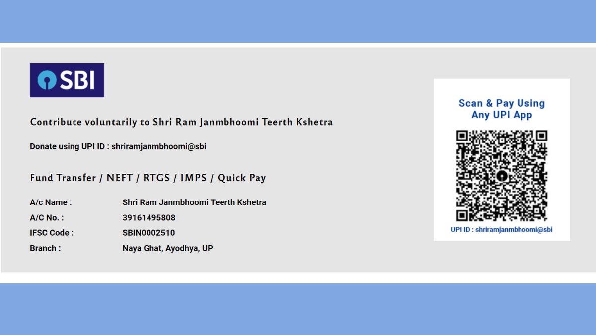 श्री राम जन्मभूमी तीर्थ क्षेत्र की ऑफिशियल वेबसाइट (https://srjbtkshetra.org/donation-options/) पर विजिट कर यूपीआई ऐप से क्यूआर कोड स्कैन कर सकते हैं। हालांकि, क्विक पेमेंट के इस तरीके में सावधानी बरतनी की जरूरत होगी।