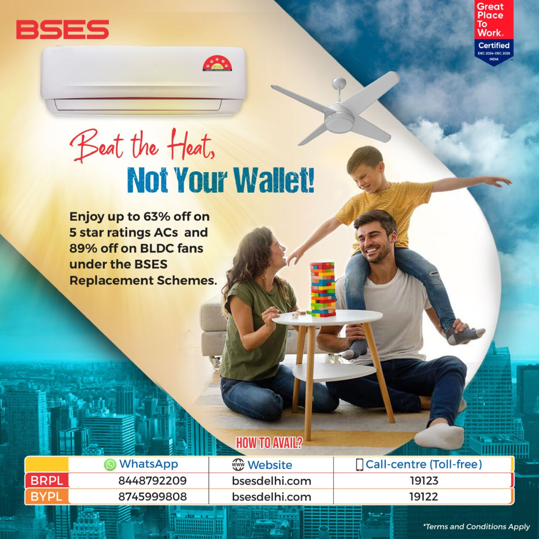 दिल्ली की प्रमुख बिजली वितरक कंपनी BSES यमुना और BSES राजधानी ग्राहकों को एसी कूलर और पंखे पर भारी डिस्काउंट दे रही है। पुराने 3 स्टार एसी और पंखों को बदलकर 5 स्टार एप्लायंसेज खरीदने पर 89 प्रतिशत तक की छूट मिल रही है। इससे बिजली की मांग को कम करने में मदद मिल सकती है।