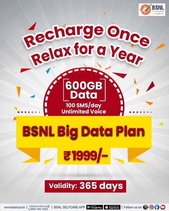 बीएसएनएल के इस शानदार 1,999 रुपये वाले रिचार्ज प्लान में आपको अनलिमिटेड कॉलिंग, हर दिन 100 एसएमएस और 365 दिनों की वैलिडिटी के साथ 600 GB डेटा मिलता है। यह प्लान भारत के सभी बीएसएनएल सर्किलों में उपलब्ध है। यानी इस एक वन-टाइम रिचार्ज प्लान के साथ आपको हर महीने रिचार्ज के झंझट से मुक्ति मिल जाती है। इसके अलावा बीएसएनएल एक खास ऑफर भी दे रहा है।