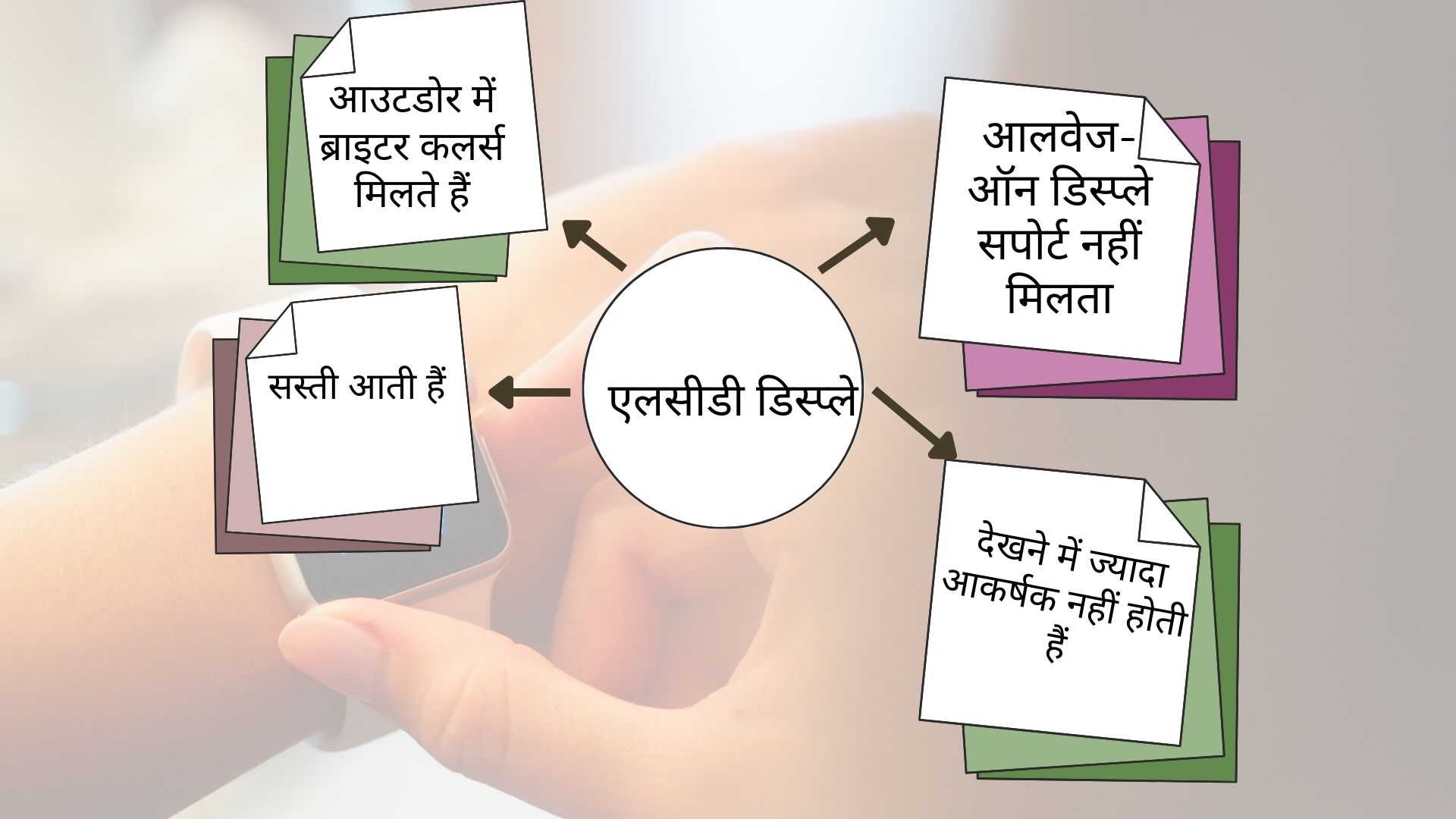 एलसीडी डिस्प्ले वाली वॉच देखने में उतनी आकर्षक नहीं लगती हैं, जितनी एमोलेड डिस्प्ले वाली वॉच होती हैं। इस तरह की वॉच की बैटरी जल्दी ड्रेन होती है। एलसीडी डिस्प्ले के साथ वॉच आलवेज- ऑन डिस्प्ले को सपोर्ट नहीं करती हैं।