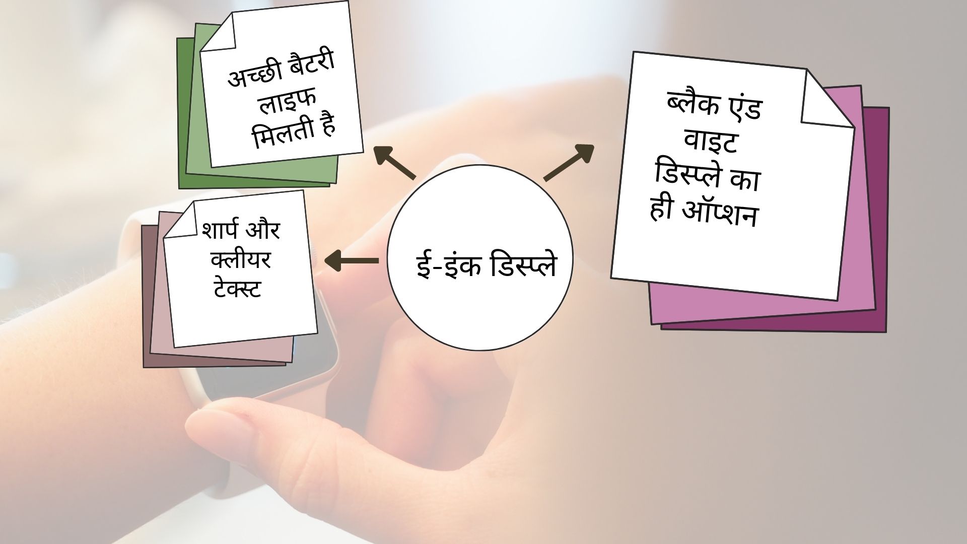 ई-इंक डिस्प्ले वॉच की खूबी है कि इसमें बैटरी लाइफ अच्छी मिलती है। इस वॉच में यूजर को शार्प और क्लीयर टेक्स्ट देखने को मिलते हैं। इस डिस्प्ले के साथ यूजर को अच्छा व्यूइंग एक्सपीरियंस मिलता है। वॉच का इस्तेमाल करने के दौरान आंखों में स्ट्रैस नहीं पड़ता है।