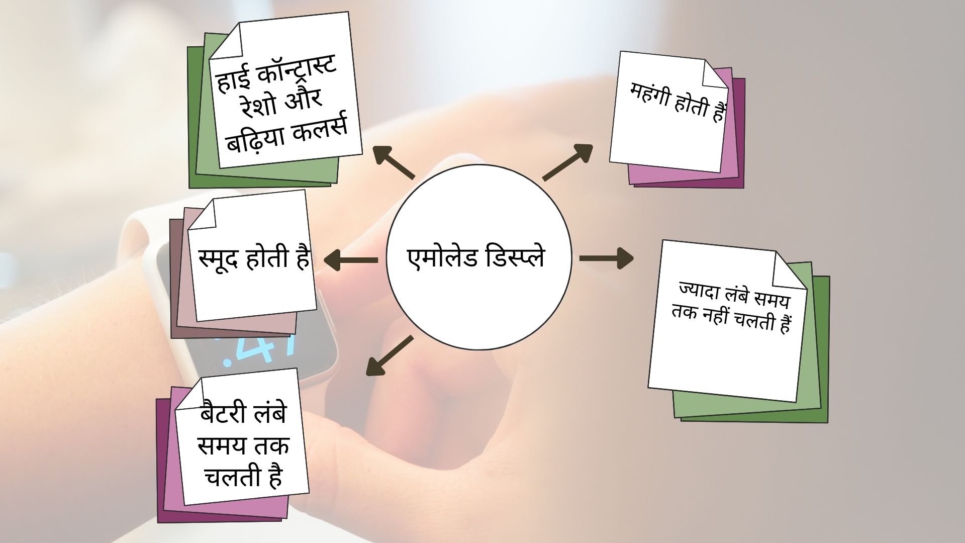 स्मार्टवॉच में स्मार्टफोन की तरह ही एमोलेड डिस्प्ले पेश किया जाता है। हालांकि, स्मार्टवॉच में एमोलेड के अलावा भी एलसीडी, टीएफटी एलसीडी, ट्रांसफ्लेक्टिव एलसीडी और ई-इंक डिस्प्ले भी पेश किया जाता है। ये डिस्प्ले एक-दूसरे से कैसे अलग होते हैं और किन फायदे और नुकसानों के साथ आते हैं बता रहे हैं-