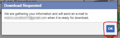 इसके बाद फेसबुक आपको बताएगा कि आपके आपके मेल पर जानकारी दे दी जाएगी जब डाउनलोडिंग के लिए आपका कंटेंट तैयार हो जाएगा। Ok ऑप्शन पर क्लिक करें।