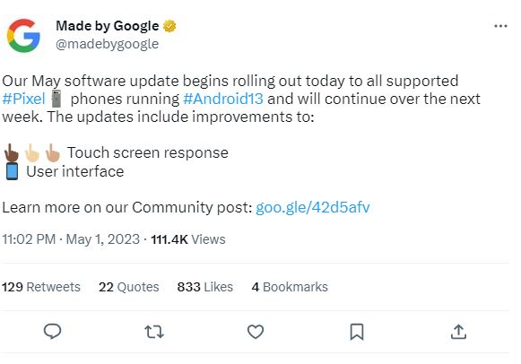 कंपनी द्वारा पिछले दो महीनों में देरी के बाद मई का अपडेट समय पर रोल आउट हो गया। Google ने ट्वीट किया कि अपडेट अगले सप्ताह तक जारी रहेगा। कंपनी ने कहां कि हमारा मई सॉफ्टवेयर अपडेट आज #Android13 चलाने वाले सभी समर्थित #Pixel फोन के लिए शुरू हो रहा है और अगले सप्ताह तक जारी रहेगा। अपडेट में टच स्क्रीन प्रतिक्रिया और यूजर इंटरफेस सुधार शामिल हैं।