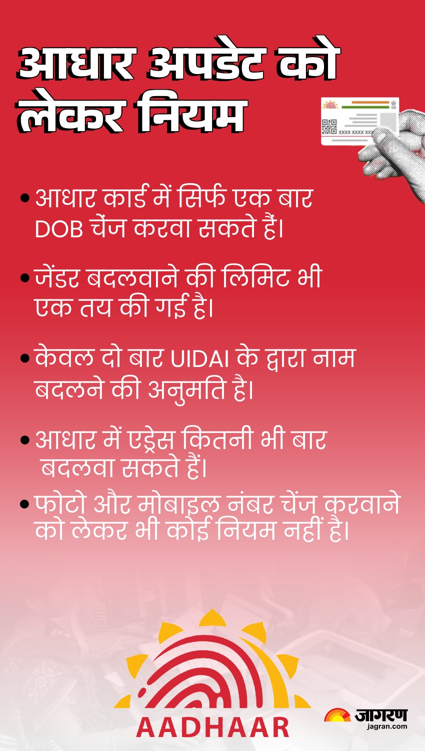 यूआईडीएआई ने आधार अपडेट को लेकर सख्त नियम बनाए हैं। अगर आप पहली बार आधार अप्लाई करते वक्त कुछ गलतियां कर देते हैं, तो उनमें सुधार का मौका मिलता है। डीओबी और जेंडर केवल एक ही बार अपडेट करवा सकते हैं। एड्रेस बदलवाने को लेकर कोई नियम नहीं है। जबकि नाम में सुधार का मौका दो बार मिलता है।