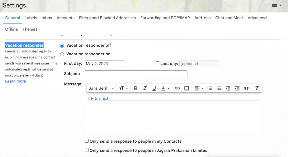 - इसके बाद General में नीचे जाएं जहां आपको सबसे नीचे Vacation responder दिखाई देगा।