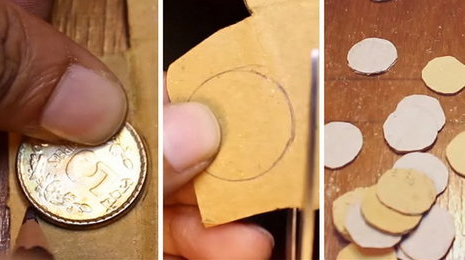 1. सबसे पहले 5 रुपये का कॉइन बोर्ड पर रखें और उसके चारों तरफ पेन से मार्क बना लें। अब गोल आकार को कैंची से काट लें। करीब 10 से 12 आकार को काटें।