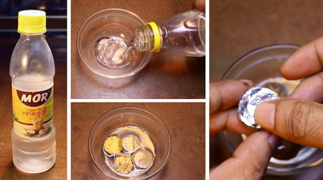 3. अब कांच का एक बाउल लें और उसमें सिरका डालें। फिर कार्डबोर्ड वाले कॉइन को उसमें डुबा दें। इसके बाद 5 रुपये के कॉइन पर कार्ड बोर्ड वाला कॉइन रखकर उसके ऊपर एल्युमिनियम फॉइल वाला कॉइन रख दें।