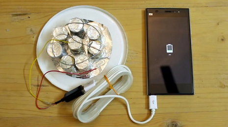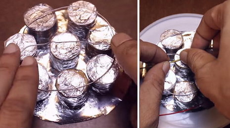 6. फोन चार्ज करने के लिए आपको ऐसे ही 8 सेट जोड़कर एक सेट बनाना होगा। इसके बाद सभी 8 सेट को एल्यूमिनियम फॉइल पर रख दें और कॉपर वायर से कनेक्ट करें।