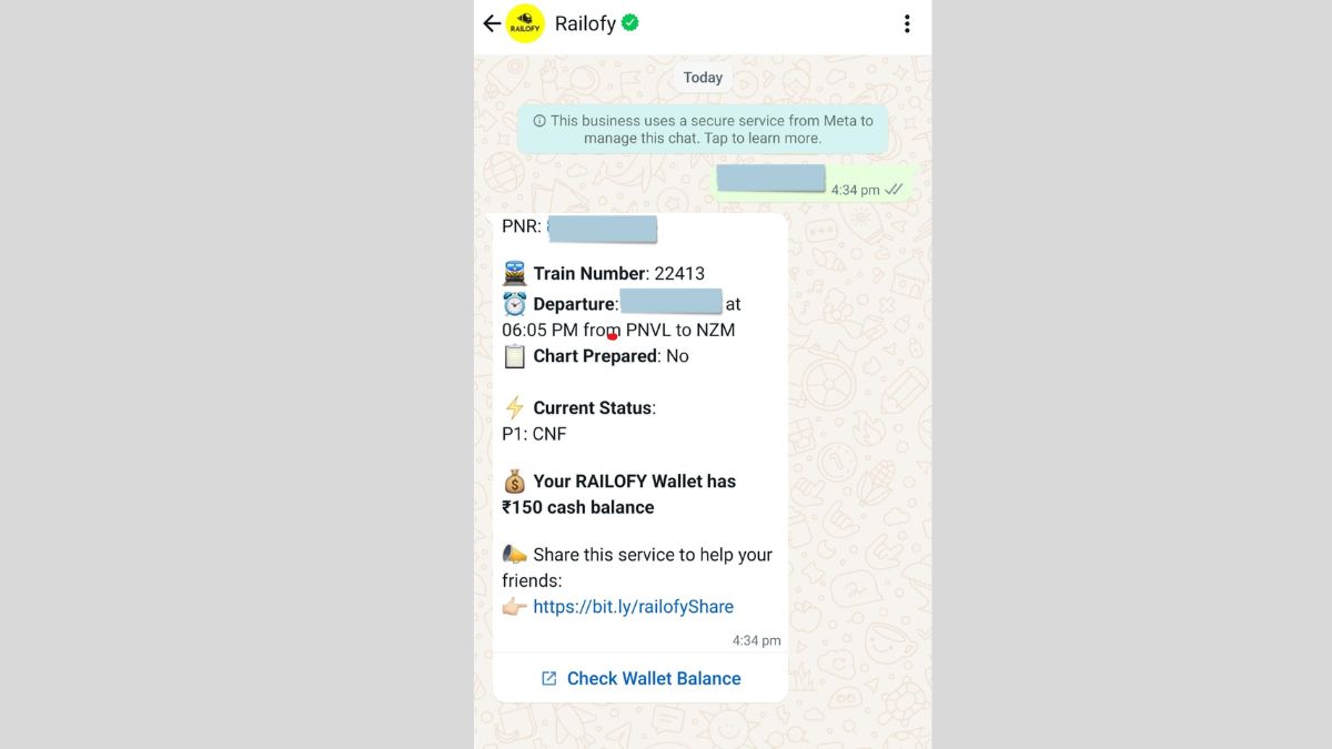 - Railofy का वॉट्सऐप चैटबॉट नंबर के साथ चैट पेज पर आना होगा।