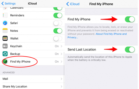 सेटिंग पर जाएं फिर iCloud पर टैप करें। इसके बाद Find My iPhone पर टैप करें। फिर Find My iPhone और Send Last Location को इनेबल कर दें। (Settings< Find My iPhone<Toggle on Find My iPhone<Send Last Location)