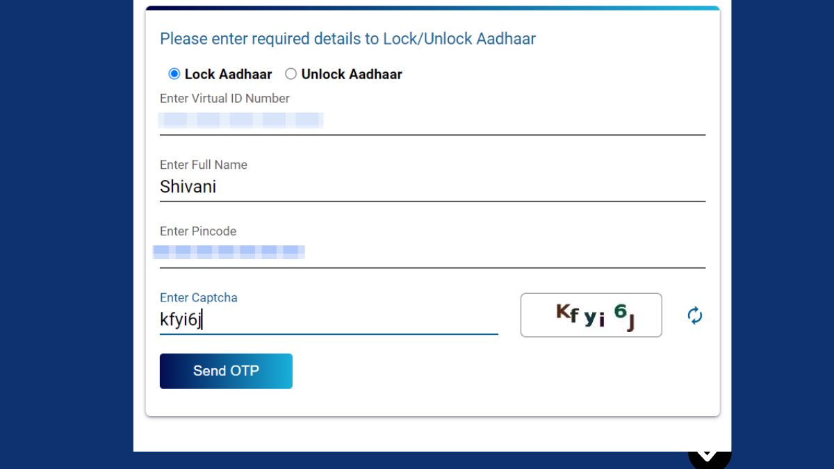 - अब बायोमेट्रिक को ऑनलाइन लॉक करने के लिए वर्जुअल आईडी, नाम, पिनकोड और कैप्चा एंटर कर सेंड ओटीपी पर क्लिक करना होगा।