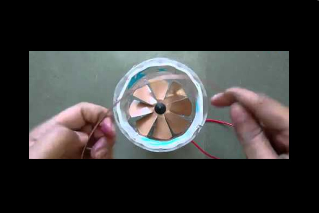 डिओडरेंट की बोतल के ऊपर और नीचे के हिस्से को काट लें। इसके बाद जो बीच वाला हिस्सा बचा है उसे भी बीच में से काटकर सीधा कर लें। अब जो आपने प्लासटिक की बोतल का नीचे वाला हिस्सा काटा है इसे उस डिओडरेंट की शीट पर रख दें और मार्क कर लें। अब जो गोला मार्क किया है उसे काट लें। अब उसके ठीक बीच में एक छेद बनाइए। अब जो गोला आपने काटा है उसके चारों तरफ को ठीक से नाप कर 4 से 5 सीधे मार्क करें और काट लें। अब उन कट्स को फैन के ब्लेड्स की तरह मोड़ दें। अब जो आपने गोले में छेद किया था उसमें मोटर डालकर उसे चिपका दें।