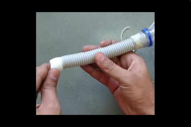 7- इसके बाद आपने जो बोतल का ऊपर वाला हिस्सा काटा था उसके मुंह के जरिए वैक्यूम क्लीनर का पाइप फिक्स कर दें।