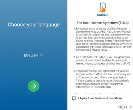 2- एप डाउनलोड करने के बाद एप को ओपन करें। अब आपको भाषा का चुनाव करने के लिए कहा जाएगा। इसके बाद आपकी स्क्रीन पर उमंग एप की नियम व शर्तें दी गई होंगी। इसके लिए नीचे दिए गए बॉक्स पर टिक करें और Next पर क्लिक कर दें।
