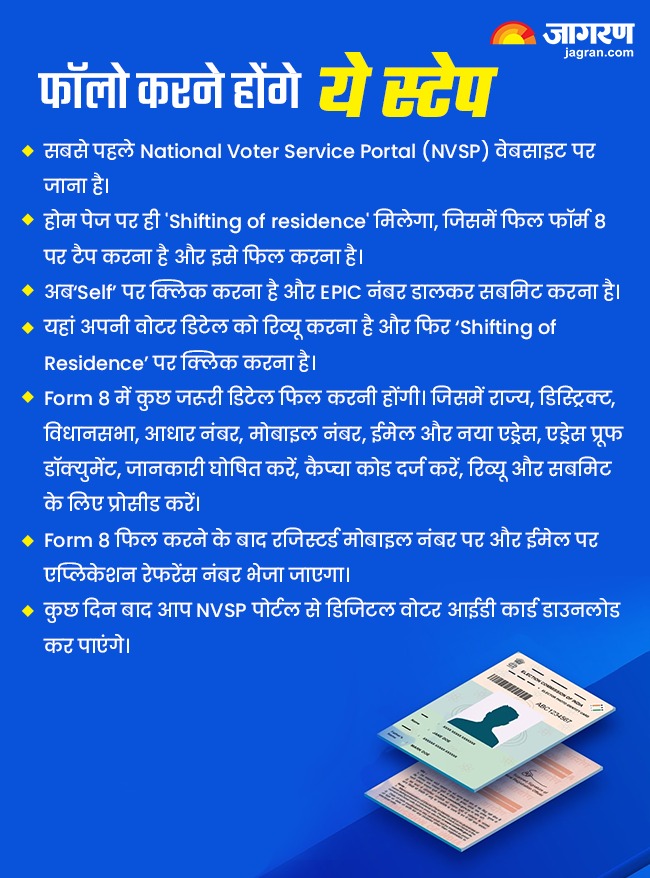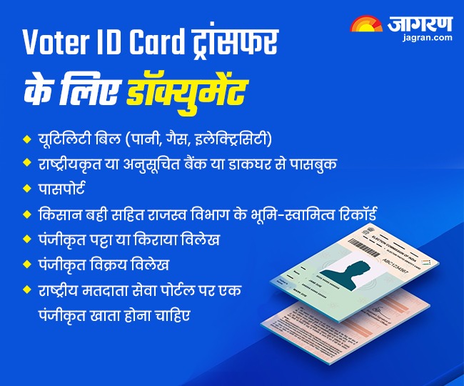 भारत निर्वाचन आयोग ने वोटर आईडी कार्ड को नए पते पर ट्रांसफर करने की सुविधा ऑनलाइन दी हुई है। इसके लिए आपको कुछ डॉक्युमेंट की जरूरत होगी।