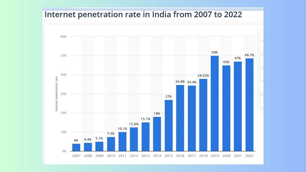 भारत में इंटरनेट पहुंच की दर को साल 2007-2022 तक में बढ़त के साथ Statita (Statistics Portal for Market Data) के बार ग्राफ में देखा जा सकता है।