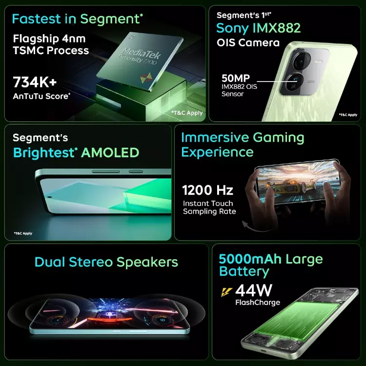 iQOO Z9 5G मोबाइल 12 मार्च 2024 को लॉन्च किया गया था। ये फोन 120 हर्ट्ज रिफ्रेश रेट 6.67-इंच टचस्क्रीन डिस्प्ले के साथ आता है जो 394 पिक्सल प्रति इंच (पीपीआई) की पिक्सल डेनसिटी पर 1080x2400 पिक्सल (FHD+) का रेजोल्यूशन ऑफर करता है। iQOO Z9 5G एक ऑक्टा-कोर MediaTek Dimensity 7200 प्रोसेसर पर चलता है। ये फोन 8GB रैम के साथ आता है। इसमें 5,000mAh की नॉन-रिमूवेबल बैटरी मिलती है और ये 44W फ्लैश चार्ज फास्ट चार्जिंग को सपोर्ट करता है।
