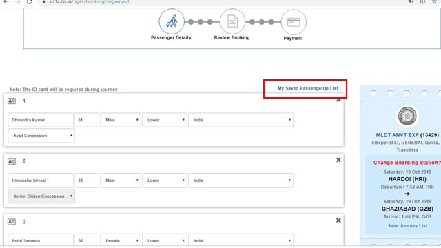 7. इसके बाद जब भी आप टिकट बुक करेंगे तो Book Now (यहां जानें स्टेप बाय स्टेप प्रोसेस) पर क्लिक कर आपको बुकिंग स्क्रीन पर रिडायरेक्ट हो जाएंगे। यहां बायीं तरफ आपको My Saved Passenger(s) List लिखा दिखाई देगा। इस पर क्लिक करें।